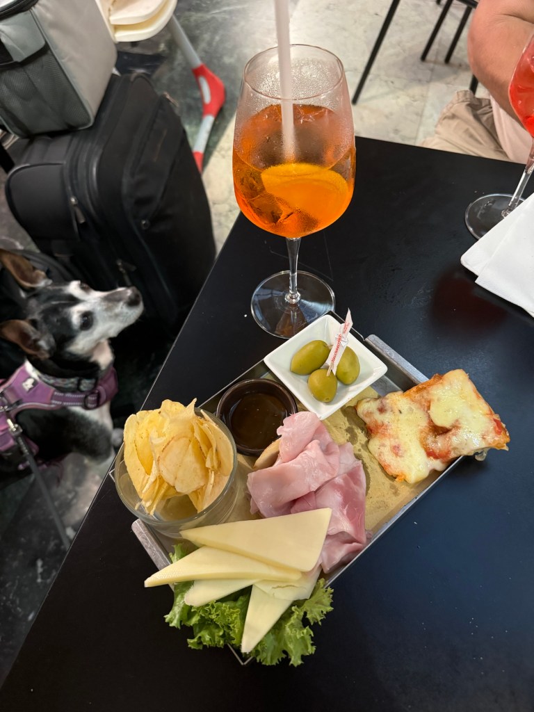 Our night train departs Milano Centrale at 20:10 so we have about 2 hours to wait. This was intentional to ensure we arrived on time (trains are notoriously in ritardo — late — in Italy) and unstressed. Shortly after arrival we found ourselves at Bistrot Milano Centrale with drinks aperitivo. Another thing to love about Italy is that dogs are welcome nearly everywhere!
